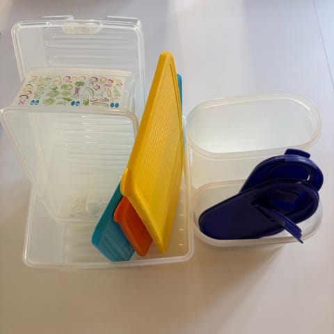 Mindre plastbokser uten lokk, bakeboller, rivjern.