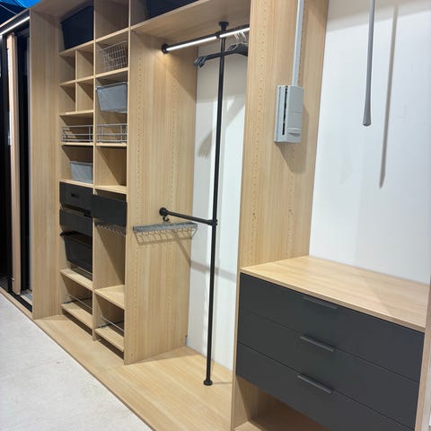 Selges med hylleplater, kurv og garderobestang.