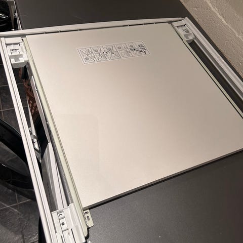 Uttrekkbar plate for å ha mellom vaskemaskin og tørketrommel. Stødig plate til å brette klær eller lignende.
