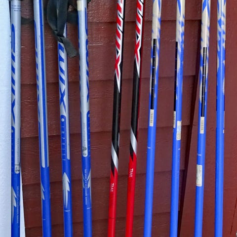 Selger 7 stk. skistaver. Fra venstre mot høyre på bildet. To. stk l 150cm 1stk 95cm 1stk 85 cm 1stk 80cm. Alpin staver 110cm. (Solgt) o100cm 95cm. 50,- pr stk