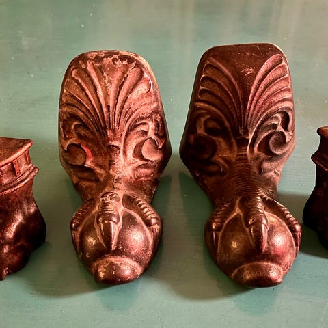 Flotte antikke løveføtter i messing - rester av trevirke og gips - Disse kan man bygge et flott bord av!