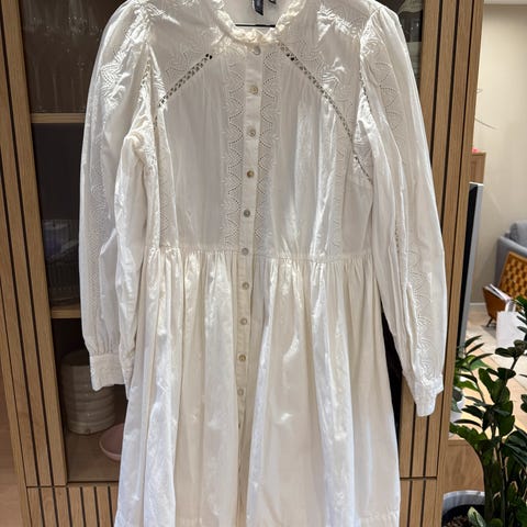 Ubrukt YAS kjole i hvit bomull for dame i størrelse M. Kjolen har lang lengde, lange ermer og belte i livet som kan knytes foran. Den har dekorative detaljer foran og på ermene, samt lukking foran. Passer til ulike anledninger der en enkel, hvit kjole ønskes. Kan sendes & hentes!