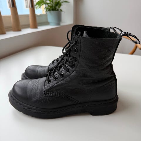 Dr. Martens mokkasiner i skinn i størrelse 40. Skoene har svart overlær med frynser og metallspenne over vristen, samt leopardmønstret frontparti. Kraftig såle i klassisk Dr. Martens-stil gir stabilitet og støtte. Passer som hverdags- og fritidssko i sesonger der man ønsker lukkede sko.