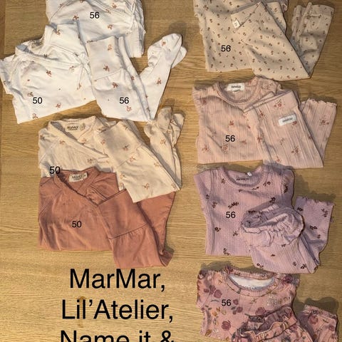 Bodyer, tynne ulldresser, pyjamas, bukser, rompere, luer mv. Ulike merker som MarMar Copenhagen, newbie, mv. noe hjemmestrikk og mye ull, sett i ribb mv.