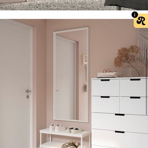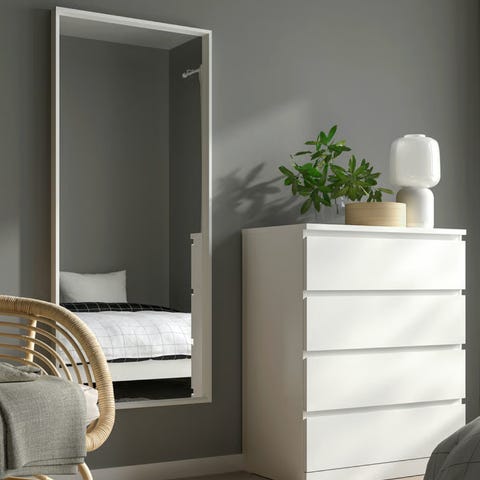 IKEA speil med svart ramme. Rektangulært helfigurspeil som kan monteres på vegg. Speilet har en smal, mørk ramme og oppheng på baksiden for enkel montering. Passer i gang, soverom eller andre rom der det er behov for et helfigurspeil.