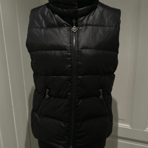 Brun dunvest. Nesten ikkje brukt. Fin til våren eller som ytterplagg på vinteren. Knappar framme og i sidelommene. Kan stramme hetta.