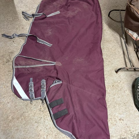 Trinity dekken 50g str 135. Er noen rifter i teppe. Ikkje direkte hull. Bør impregnere. Ikkje vanntett på regnfulle dager