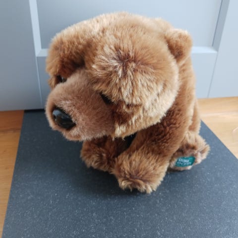 Barneleke i form av et stoffdyr i brun farge. Passer som leke for barn.