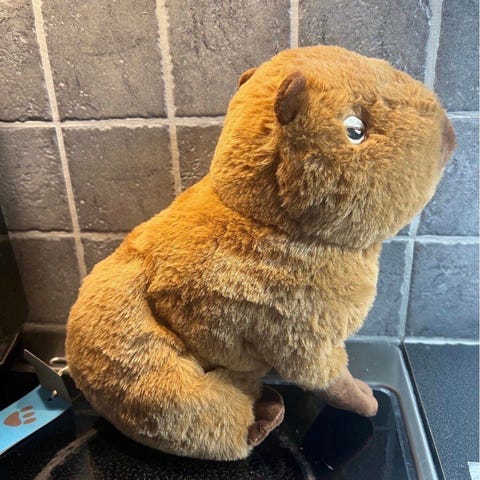 M barneleketøy i form av et brunt kosedyr. Passer som lekefølge for barn.