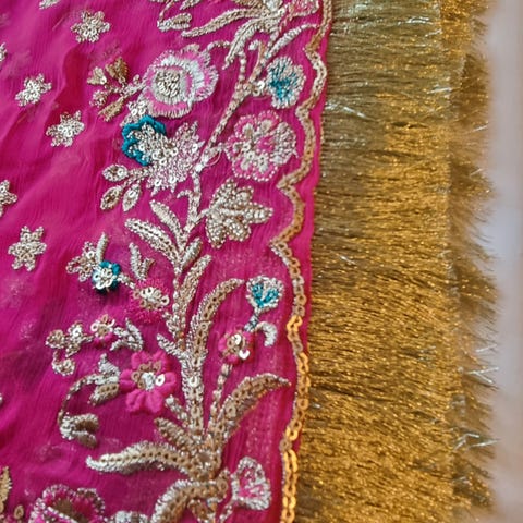 Nydelig håndbrodert perlearbeide. klippet fra en Indisk Sarie og kan gjenbrukes på mange forskjellige måter, til kanter på et selskapsantrekk, til veske, duker og gardiner. Jeg ser for meg å plassere den nederst på en selskapskjole..