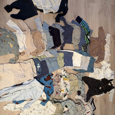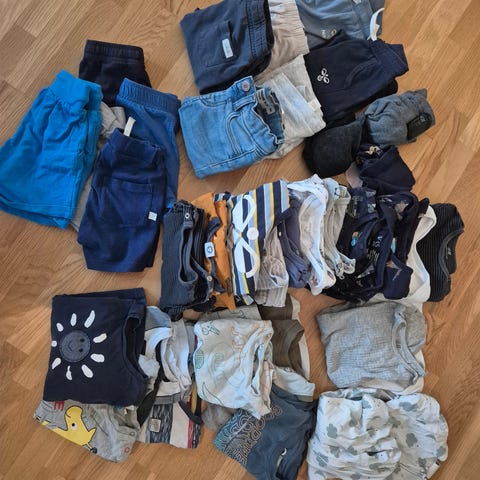 10 bodyer, diverse bukser, 2 tskjorter, 2 skjorter, 1 fleecegenser, diverse gensere