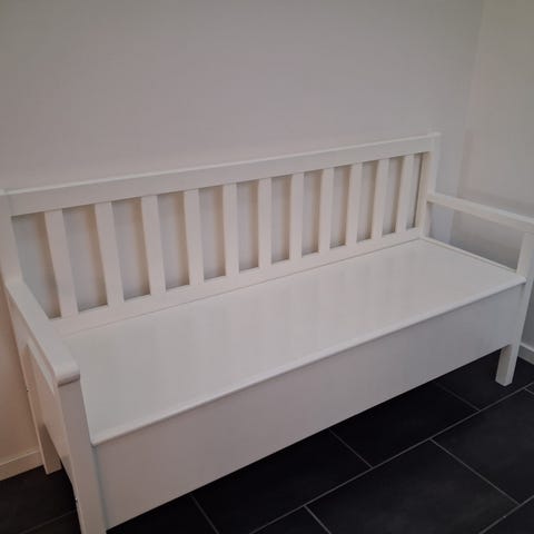 Hvit benk med oppbevaring i tre. Benken har rygg med sprosser og armlener på begge sider. Setet kan løftes opp og gir tilgang til et romslig oppbevaringsrom under. Egner seg for bruk i gang, stue eller soverom der det er behov for både sitteplass og oppbevaring. Benken er synlig brukt/slitt. Må hentes