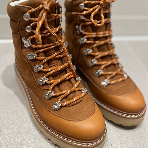 Stockholm Design Group vinterstøvler i størrelse 37. Støvlene har overdel i beige skinn med snøring foran og metallhemper. De har kraftig yttersåle med grovt mønster for bedre grep, samt kontrastfarget mellomsåle. Modellen går over ankelen og gir støtte rundt foten. Egnet som vinterstøvler til hverdagsbruk i kjøligere vær.
