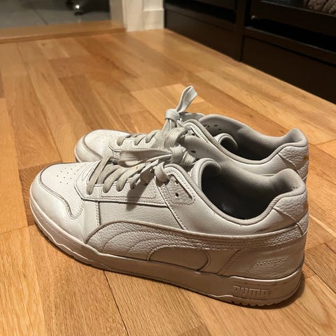 Puma sneakers i størrelse 38. Modellen er lave joggesko i helhvit farge med snøring. Overdelen har perforerte detaljer foran for ventilasjon, og skoene har polstret kant rundt ankelen for økt komfort. Yttersålen er i gummi med mønster for grep. Passer til hverdagsbruk og lett fritidsaktivitet.