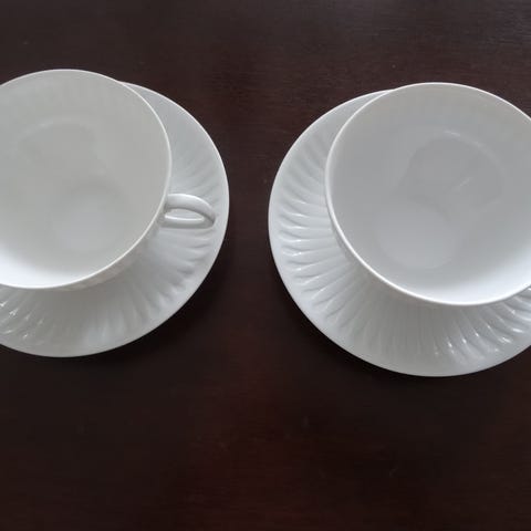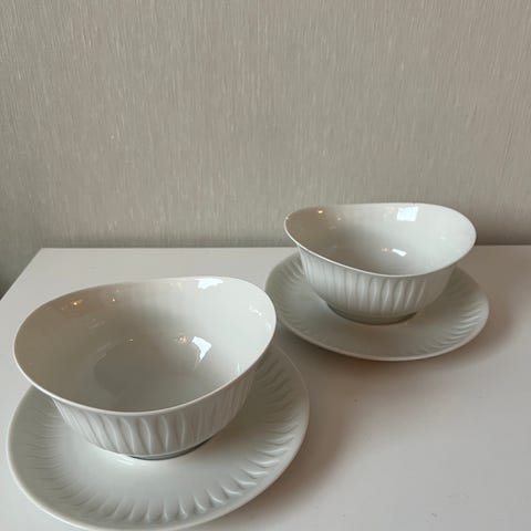 Settet består av kopp med hank og tilhørende skål/fat med rillet mønster på hvit porselen. Disse ble kjøpt på 60-tallet, og finnes ikke i butikk i dag (du får en modernisert versjon her: https://www.porsgrund.com/products/tekopp-skal-30-cl). Koppene er svært pent brukt.