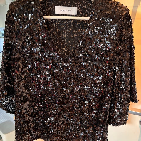 Camilla Pihl bluse for dame i størrelse L. Blusen er svart og laget i polyester. Modellen har korte puff-ermer med mansjett og dekorativ knappdetalj. Glidelås i ryggen for lukking. Passer til bruk ved både hverdags- og penere anledninger.