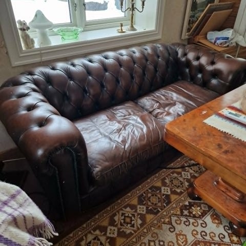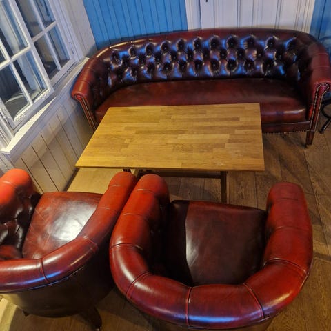 Nydelig gruppe med 3 seters sofa stol, krakk og bord .Selges grunnet flytting.Pent brukt og det er ekte skinn møbler .Selges helst samlet .