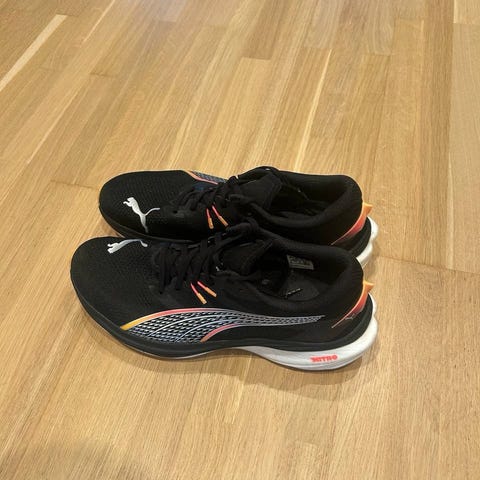 Puma Deviate Nitro Elite 3 i str 44,5 (us 11). Jeg bruker 45 i alle andre sko, men må ned en halv størrelse i Puma. Gått 44 mil, men masse futt i fremdeles. Perset på alle distanser med denne i 2025. Vurderer bud.