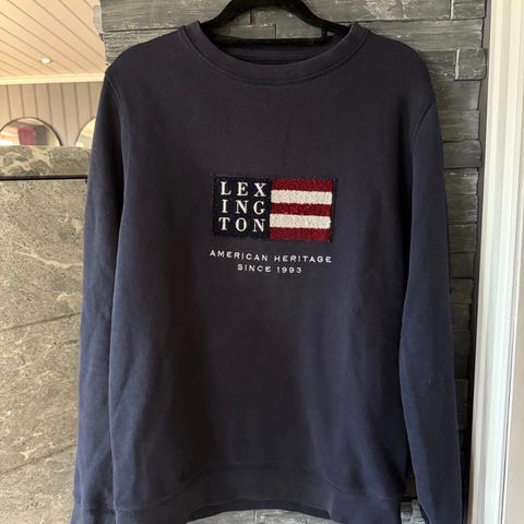 Lexington genser for herre i størrelse M. Genseren er blå og laget av 100 % bomull. Den har rund hals, lange ermer og Lexington-logo med tekst på brystet.