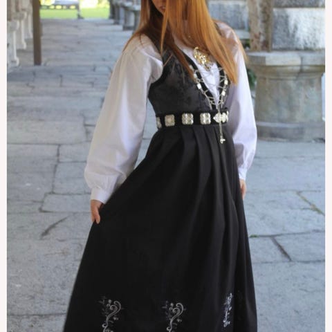 Den ligger pakket inn i bunadspose, henger i skapet. Godt ivaretatt.