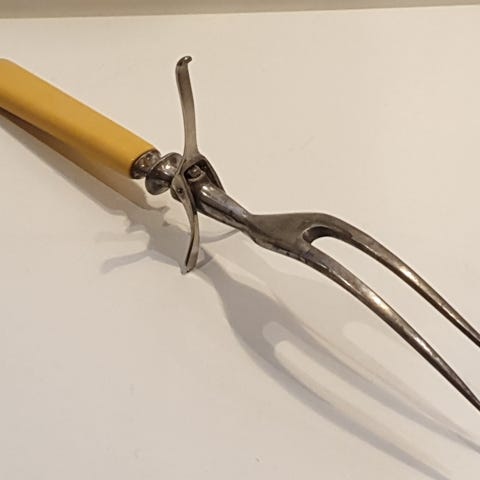 Spaden har blader i rustfritt stål og håndtak av bakelitt eller plast.