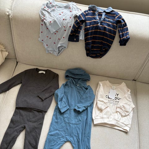 "Bamsesett" og pinnsvin-onesie fra H&M. Wrap-genser fra Newbie.