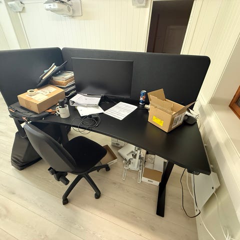 Elektrisk hev‑ og senkpult med rektangulær bordplate i svart. Pulten har to rette ben med T-fot og elektrisk betjening via kontrollpanel med kabel. Egnet som skrivebord eller arbeidsstasjon i hjemmekontor eller kontormiljø. Den elektriske høydejusteringen gjør det mulig å variere mellom sittende og stående arbeid. Bordplaten har glatt overflate og nøytral, mørk farge som passer inn i de fleste interiører.