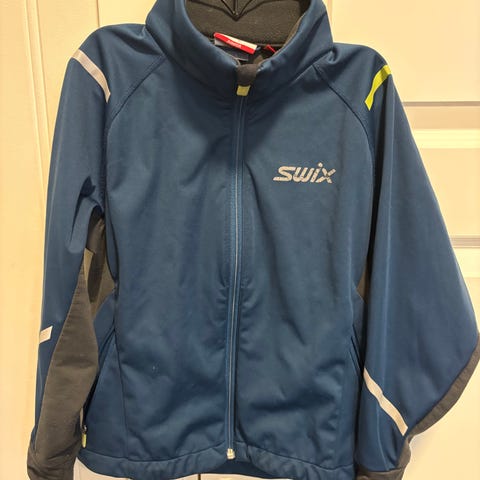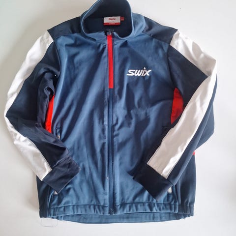 Sett bestående av jakke og bukse i blå farge. Jakken har hette, glidelås i front, refleksdetaljer og feste mellom bena som holder jakken på plass ved aktivitet. Buksen har seler, glidelås nederst på bena og elastikk ved anklene. Begge deler har Swix-logo.