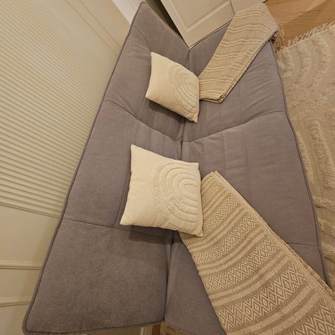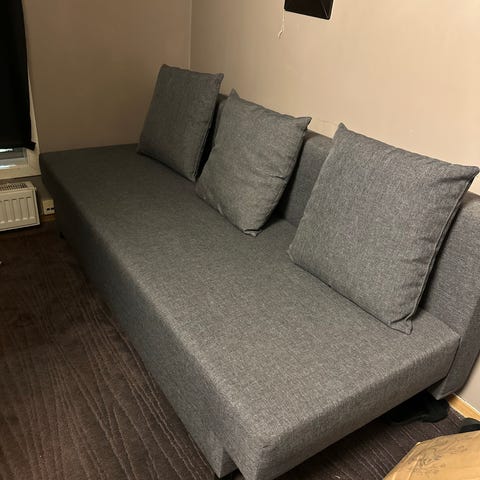 Sovesofa fra Perugia (nypris 6000-9000kr) fungerer som den skal, men har en tydelig flekk av kulepennblekk (kan muligens fjernes).