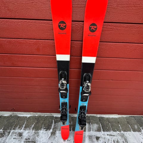 Bindinger er montert på skiene. Nærmere spesifikasjoner som lengde, radius og mål står trykt på skiene, men er ikke fullt lesbare på bildene. Skiene passer for brukere som ønsker et par allmountain/freeride-orienterte alpinski fra Rossignol med ferdig monterte bindinger.