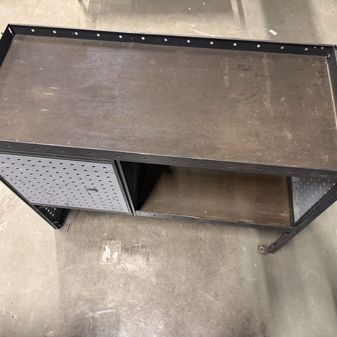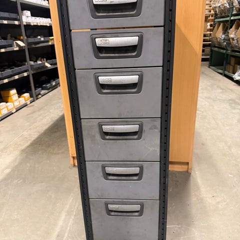 Reol med plast oppbevaringsbokser.