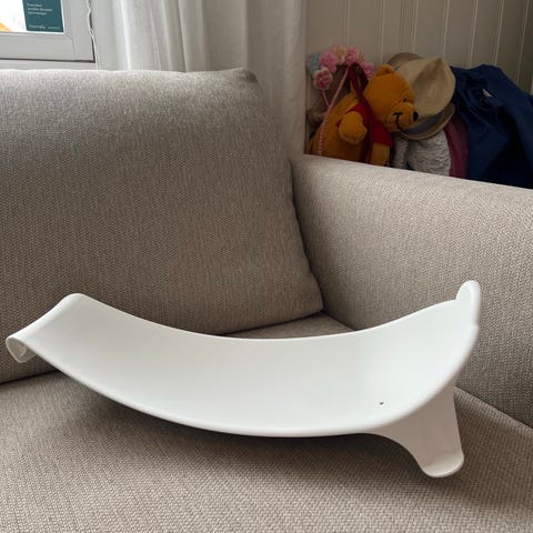 Badestøtte til baby i hvit plast. Badestøtten er formet for å gi støtte til babyen under bading og har integrerte føtter for stabilitet i badekar eller balje. Laget i solid plastmateriale som er enkelt å rengjøre. Egnet for bruk til spedbarn og små barn under bading, alltid under tilsyn av voksen