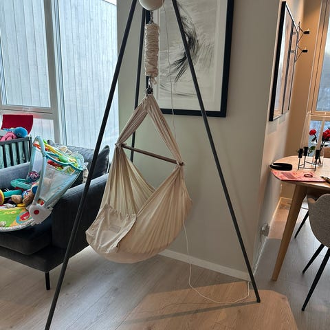 Moonboon hengevugge med mørkegrått stativ, hengevuggen er i naturfarget bomull.