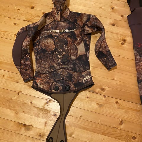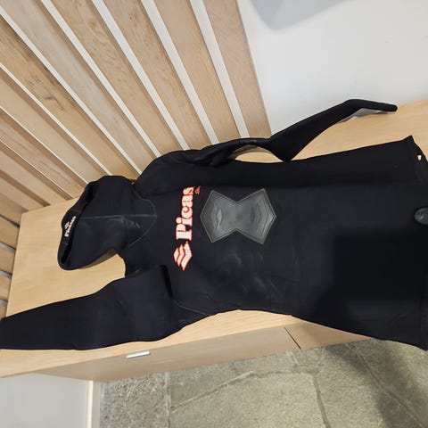 Fridykkerdrakt fra kvalitetsmerket picasso. Open cell (altså rå neopren på innside, krever at du har med ei flaske med lunket tynnblandet såpevann for å få den på). God stand til tross for at merkelappene har begynt å slippe. Ingen større skader, nesten ingen neoprensår heller. 7 mm sikrer at du holder deg varm også høstog vår. Myk og fleksibel neopren. Ladeplate på brystet. Borrelås i skritt og på skulder. Den er litt tight i størrelsen, vil anbefale den som perfekt for noen som er ca 172 cm og 74 kg med litt slinger opp og ned.