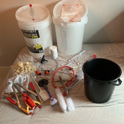 Komplett utstyr for å lage vin hjemme (fra vinsett i vertfall), selges billig.