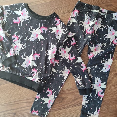 Lett foret genser og tights med sølvstrikk i livet og enhjørninger på knærne. Usikker på om tightsen er brukt i det hele tatt.