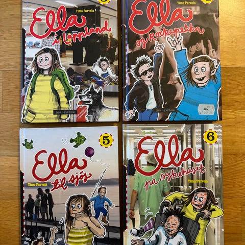 Pakke med 3 Ella barnebøker. Bøkene har illustrerte omslag og er beregnet for barn i skolealder. Innholdet følger Ella i ulike hverdags- og spenningssituasjoner. Trykt i innbundet format med tekst og illustrasjoner på norsk.