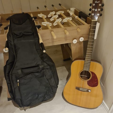 Cort akustisk gitar i dreadnought-form. Forsiden har naturfarget treverk med sort slagplate, mens baksiden og halsen er i mørkere treverk med blank finish. Gitaren har stålstrenger, gripebrett med dot-markeringer og lukket stemmemekanikk. Passer til generell akustisk spilling, øving og akkompagnement. Må kjøpe første gitarstreng .Må hentes.