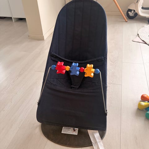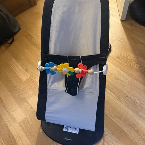 Babybjörn vippestol med to trekk. Det lilla er slitt, men har i senere tid blitt brukt som reserve, noe som har vært genialt når et må rengjøres.