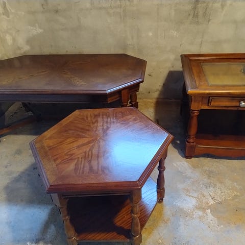her har vi tre fine Små bombai bord de tre bordene har disse mål! bredde 60 cm å dybde er 60 cm å høyde på de to som står først på bildene er 55 cm å det som står helt bakerst på bilde er 54 cm å så er de hele å pene! 400 kr får ett bord!