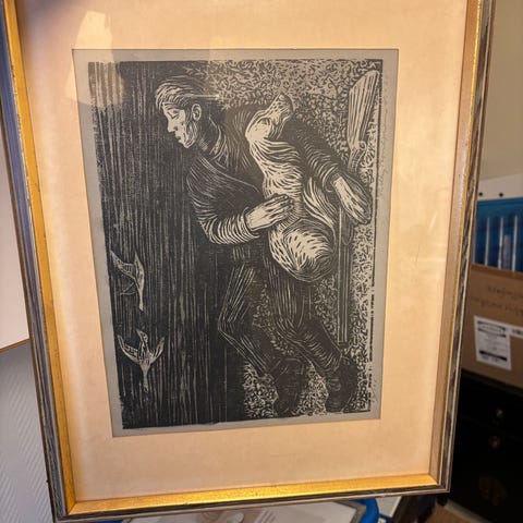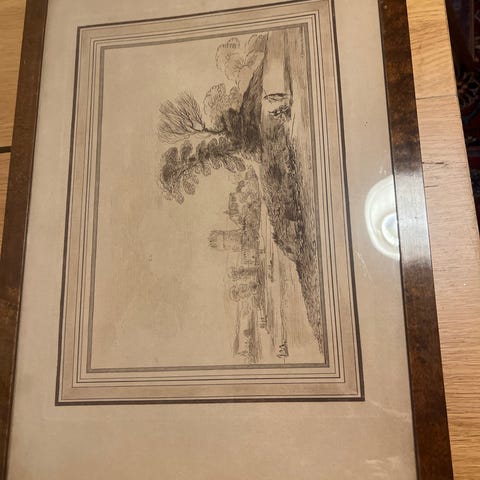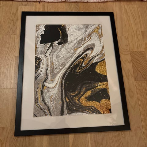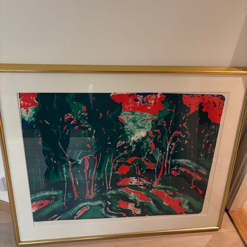 Innrammet grafisk trykk med naturmotiv i sort-hvitt. Bildet viser et landskap med naturdetaljer og er montert i en enkel treramme. Bakside har opphengstråd for veggmontering. Passer som veggbilde i stue, gang, kontor eller andre oppholdsrom.