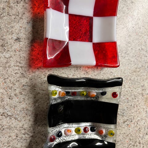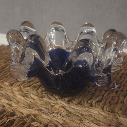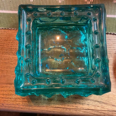 Glass skåler med firkantet form. Skåler har en høyde på cirka 6,5 cm og en bredde på cirka 12,5 cm. Materialet er klart glas med blå, raud og grønt kant. Egnet som dekorativt element eller til servering. Tilstand: pent brukte uten skader, blanke og fine. Pris 280kr for settet.