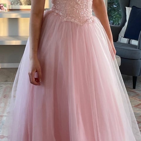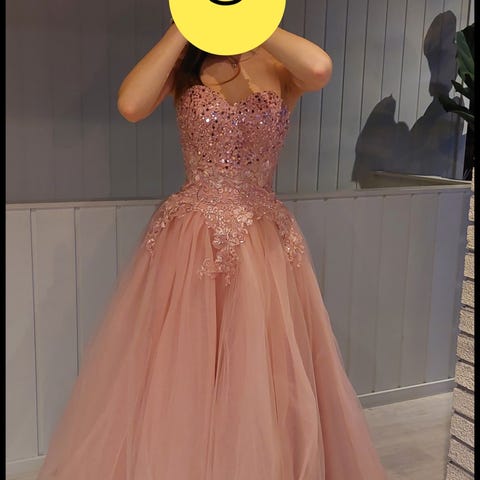 Alexandra Ritzi festkjole i beige tyll, damemodell i one size. Kjolen har stroppeløs overdel med dekorative blonde- og perledetaljer foran og bak. Livet er innsvinget med snøring i ryggen for justering av passform. Skjørtet er langt og lagdelt i tyll som faller rett ned fra livet. Egnet som festkjole til ball