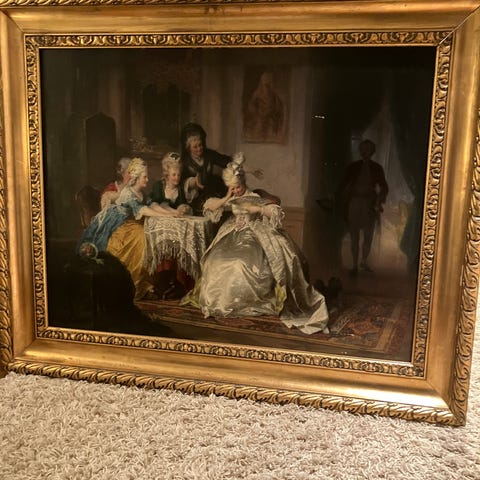 Ukjent kunstner grafisk trykk i sort-hvitt med motiv av en historisk interiørscene med flere personer og hund. Bildet er innrammet i en rektangulær, gullfarget ramme med oppheng på baksiden. Passer som veggdekor i stue, gang eller andre oppholdsrom. Størrelse er ikke oppgitt og kan måles ved behov.