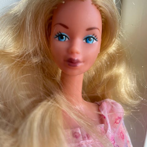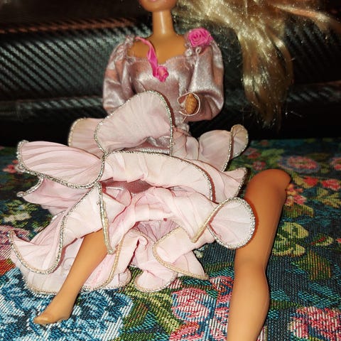 Hun bærer preg av å ha ligget på et loft i 30år. Hun mangler øredobber, veske og sko og diamanten som skal sitte foran på kjolen mangler.