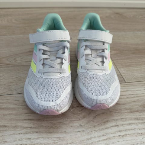 Adidas joggesko for barn i størrelse 30. Skoene er rosa med kontrastdetaljer og borrelåslukking. Noen bruksmerker men mye bruk igjen.