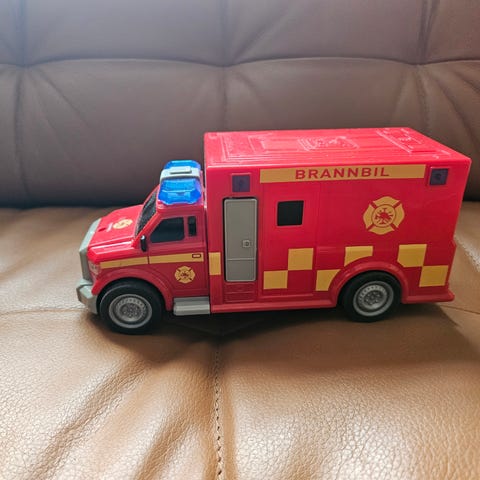 Datteren har ryddet gjennom lekene og selger en ambulanse med lys og flere valg av lyder. Kjører også fremover ved å trykke på en av knappene. Tåler mye. Hel og pen.