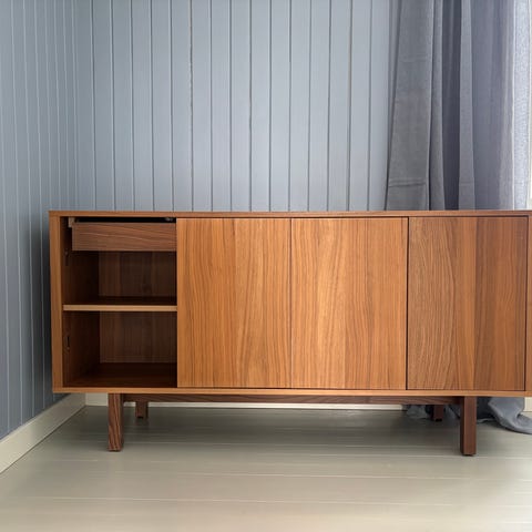 Selger IKEA Stockholm TV-benk i valnøtt. Benken har tre deler med to "etasjer" hver hvor de nederste har utgang til ledninger.
