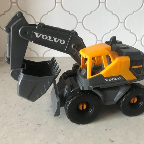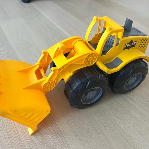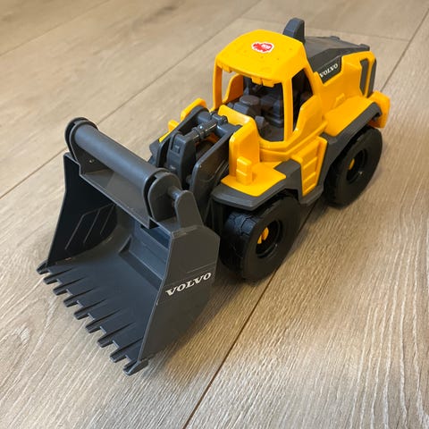 Sønnen har ryddet gjennom lekene sine og selger en Volvo hjullaster i metall. Tåler en støyt. Lys og lyd.