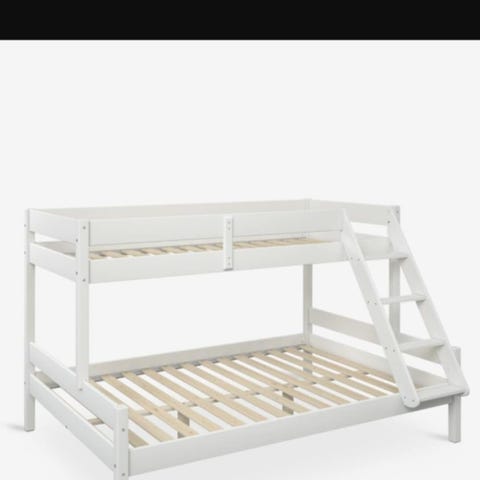Pen og solid familiekøye med madrasser. Madrassen nede er 120 x 200 cm, oppe 75 x 200. Sengen monteres til vegg, ikke frittstående. Leveres demontert.